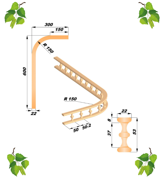 | Балюстрада мебельная угловая R 150 с балясиной 37 мм, 300 мм*600 мм, из березы. Серия "Барокко". | 1045,00 руб. |