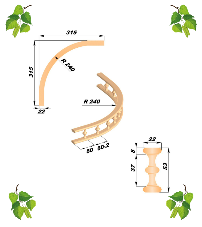 | Балюстрада мебельная угловая R 240 с балясиной 37 мм, 315 мм*315 мм, из березы. Серия "Барокко". | 671,00 руб. |