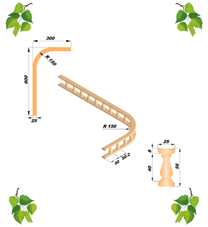 Балюстрада мебельная угловая R 150 с балясиной 40 мм, 300*600 мм, из берёзы. Серия "Ампир".