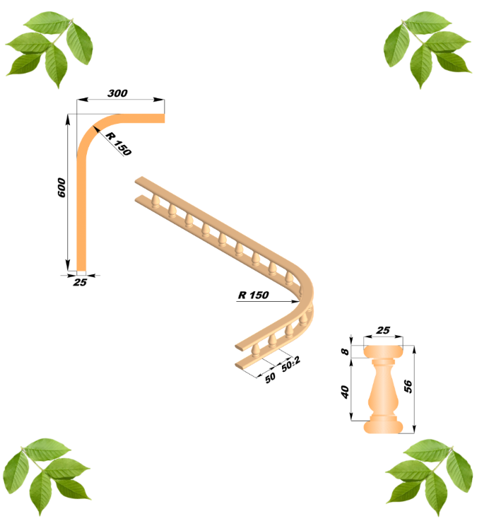 Балюстрада мебельная угловая R 150 с балясиной 40 мм, 300 мм*600 мм, из ясеня. Серия "Ампир".